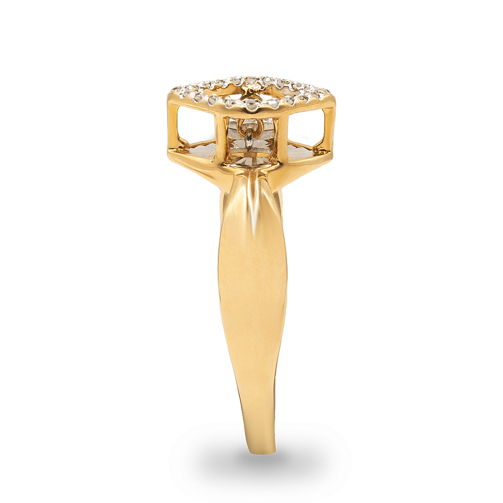 Изысканное кольцо из красного золота 585 пробы, украшенное бриллиантами, станет элегантным дополнением к вашему образу. Центральный камень – бриллиант огранки «круг» 57 граней (0,02 ct, 6/6) – окружен изящной ажурной конструкцией, дополненной россыпью из 20 бриллиантов огранки «круг» 17 граней (0,001 ct каждый). Оригинальный дизайн с геометрическими элементами придает украшению стильный и современный вид.