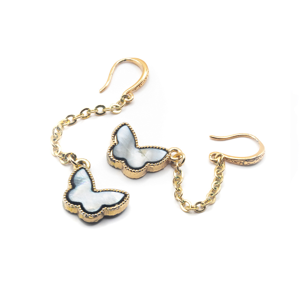 Эти элегантные серьги с перламутровыми элементами, весом 5,21 грамма, представляют собой уникальное дополнение к любому наряду. Изготовленные в форме изящных бабочек, они обрамлены золотистой оправой с рифлеными краями, придающими украшению утонченность. Блестящая перламутровая поверхность бабочек украшена тонкими черными контурами и бело-голубым градиентом, создавая благородный и эффектный вид.